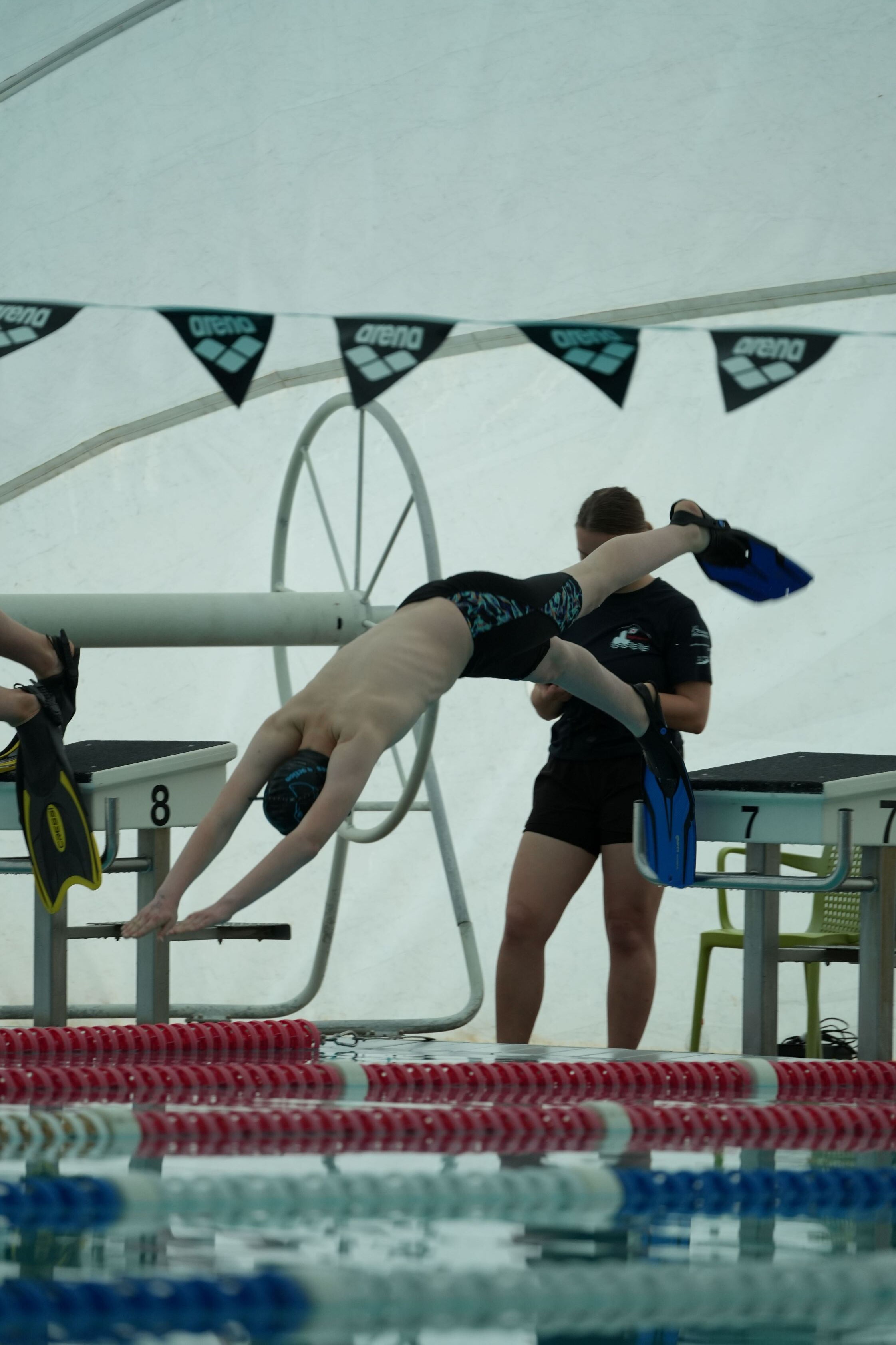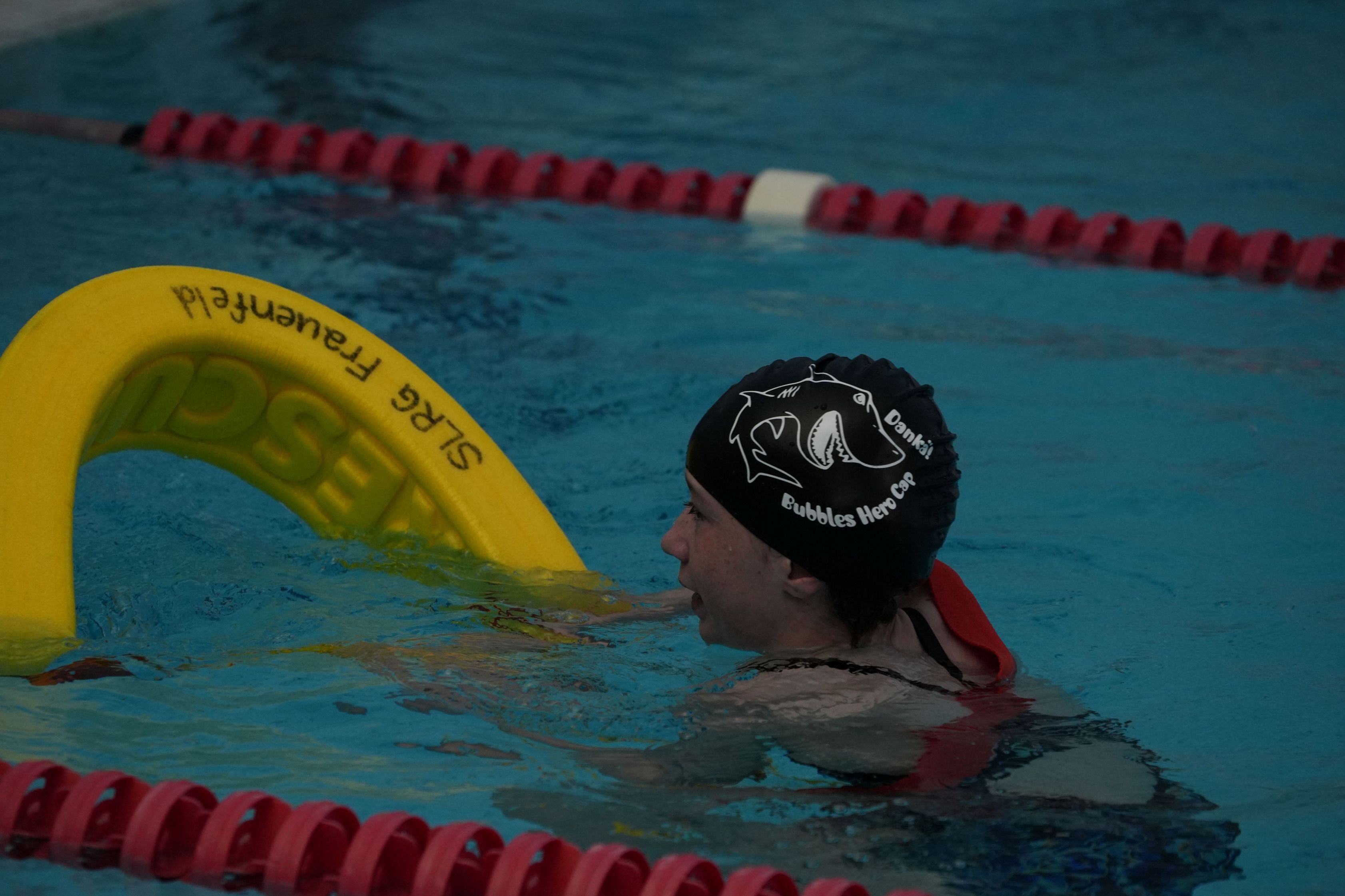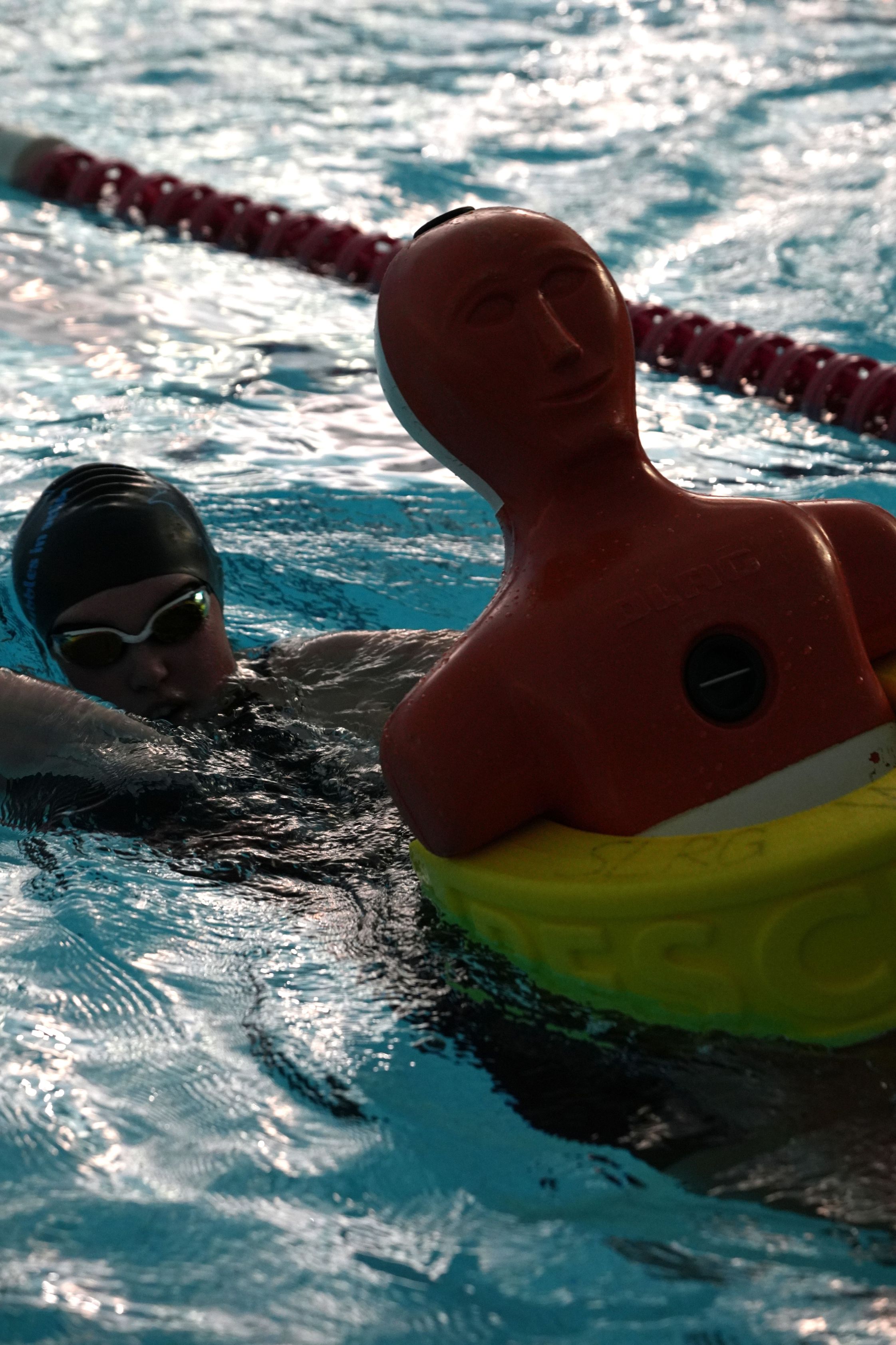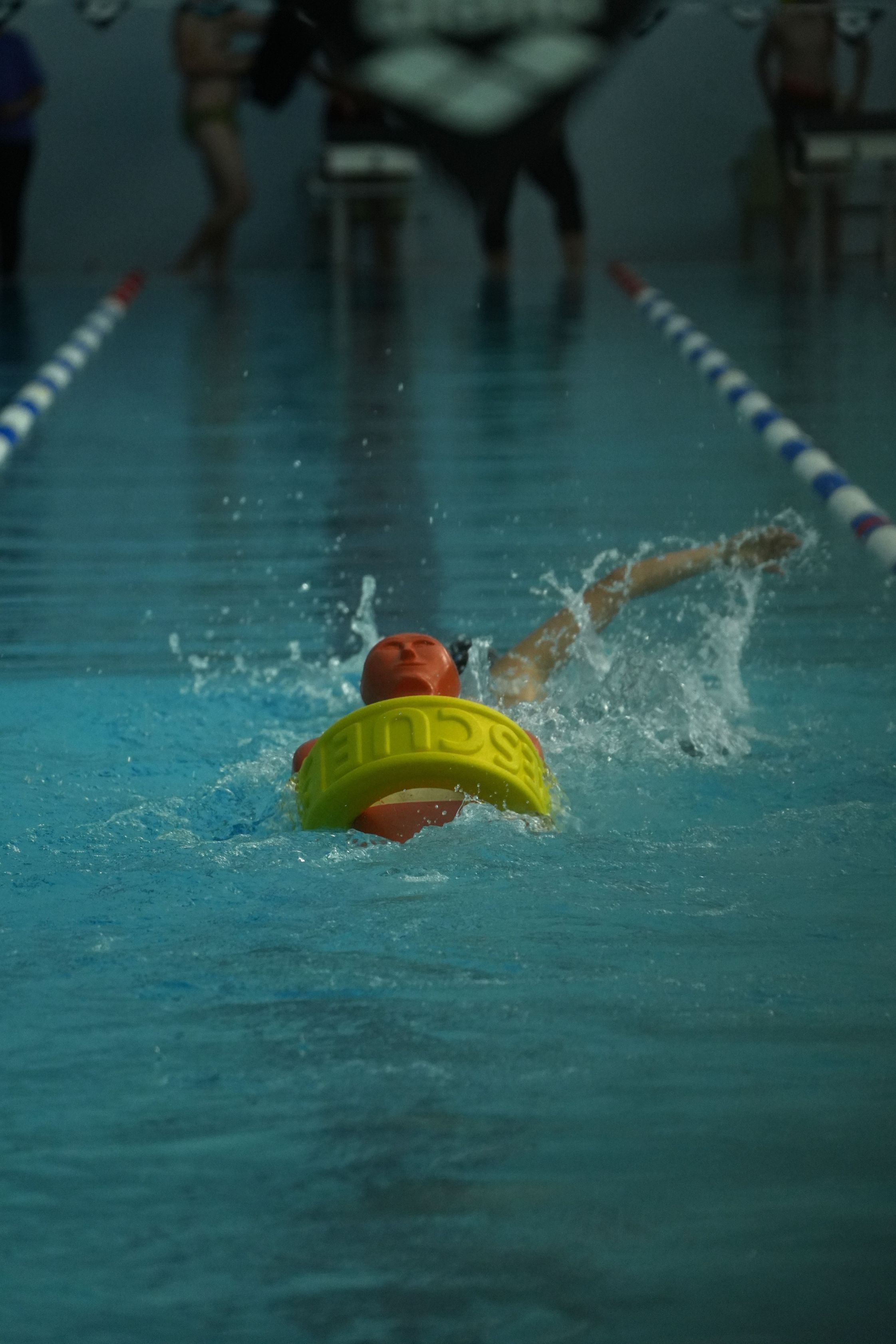Gestartet wurde mit der Hindernisstaffel, einer Teamdisziplin. Im Anschluss musste ein Ringli (oder eine Puppe) mit den Flossen gerettet werden. Dabei werden 50m geschwommen, danach wird das Ringli vom Boden gerettet und dieses dann 50m abgeschleppt. Nach der Puppenstaffel ging es weiter mit “Ringli retten ohne Flossen” (25m Schwimmen, Ringli retten, 25m Ringli abschleppen) und “Retten mit Gurtretter”. Dabei werden die ersten 50m mit Flossen und Gurtretter absolviert. Nach der Wende wird der Gurtretter geschlossen und 50m zurückgeschwommen. Bei den über 16 jährigen muss der Gurtretter der halbvollen Puppe angezogen und diese 50m zurückgezogen werden. Als Abschluss schwammen wir noch die Gurtretterstaffel. Dort wird unter anderem ein Teammitglied mit dem Gurtretter von einem anderen abgeschleppt.