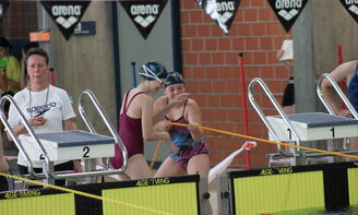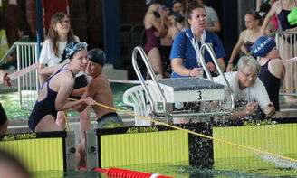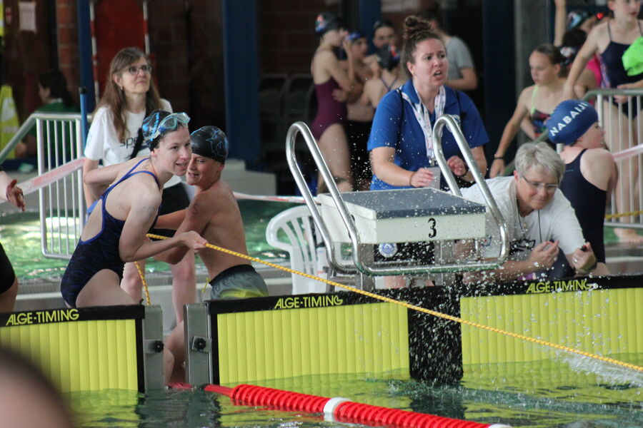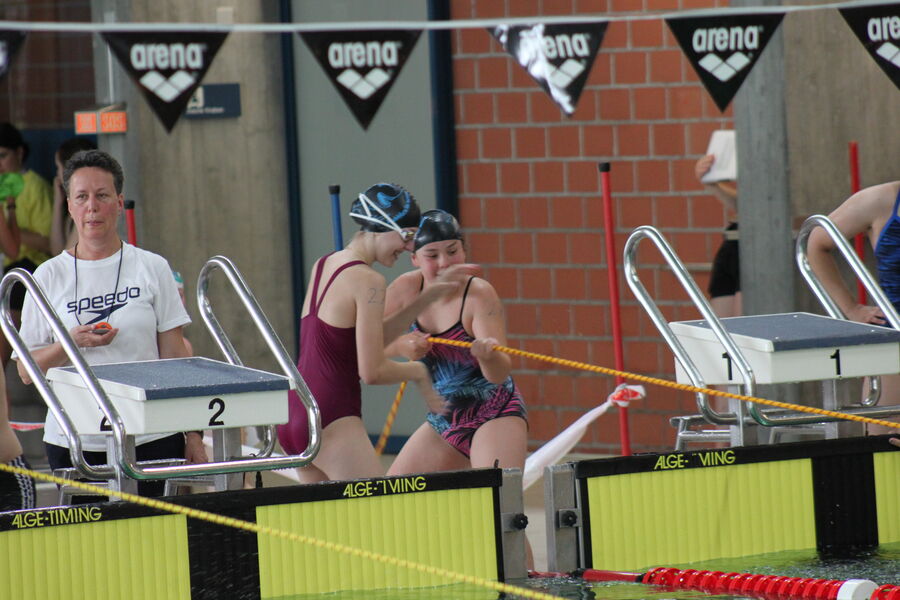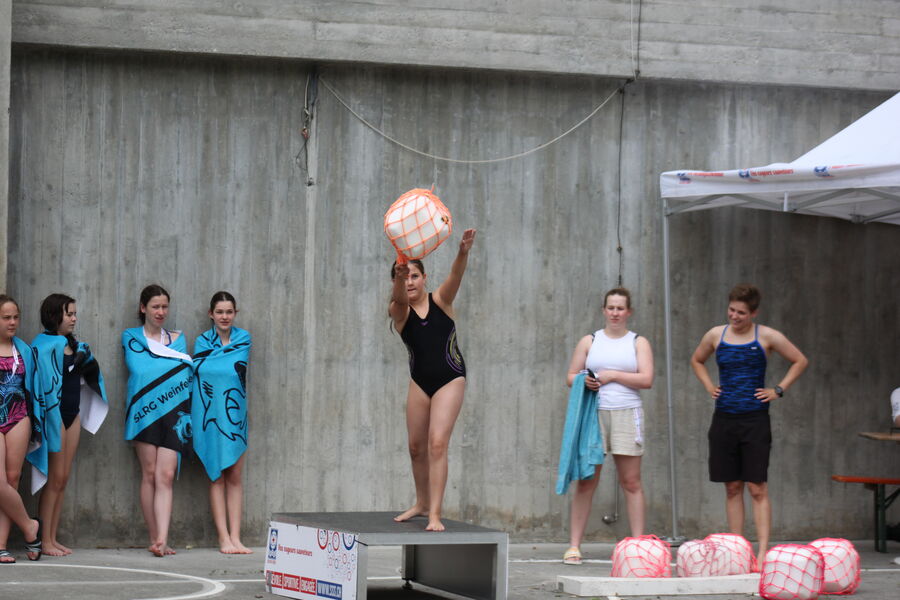 Die Rettungsleinenstaffel bildete den Abschluss des ersten Wettkampftages. Jedes Teammitglied muss mit der Leine am Rücken 25m schwimmen und wird anschliessend von den anderen zurückgezogen. Der extrem hohe Beckenrand beim Aussteigen konnte nur dank der Hilfe der Leiter erfolgreich überwunden werden.