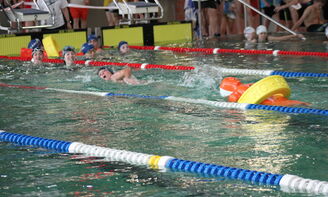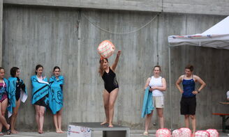 Nach dem Mittagessen folgte die Plauschdisziplin. Drei Teammitglieder pro Sektion mussten auf einem Baumstamm schwimmend den Frosch (4. Teammitglied) retten, welcher am anderen Ende des Beckens auf einem Seerosenblatt (Gymnastikmatte) sass. Auch die Kampfrichter bildeten ein Team, wurden jedoch disqualifiziert, da sie sich nicht an die Regeln hielten ;-) .