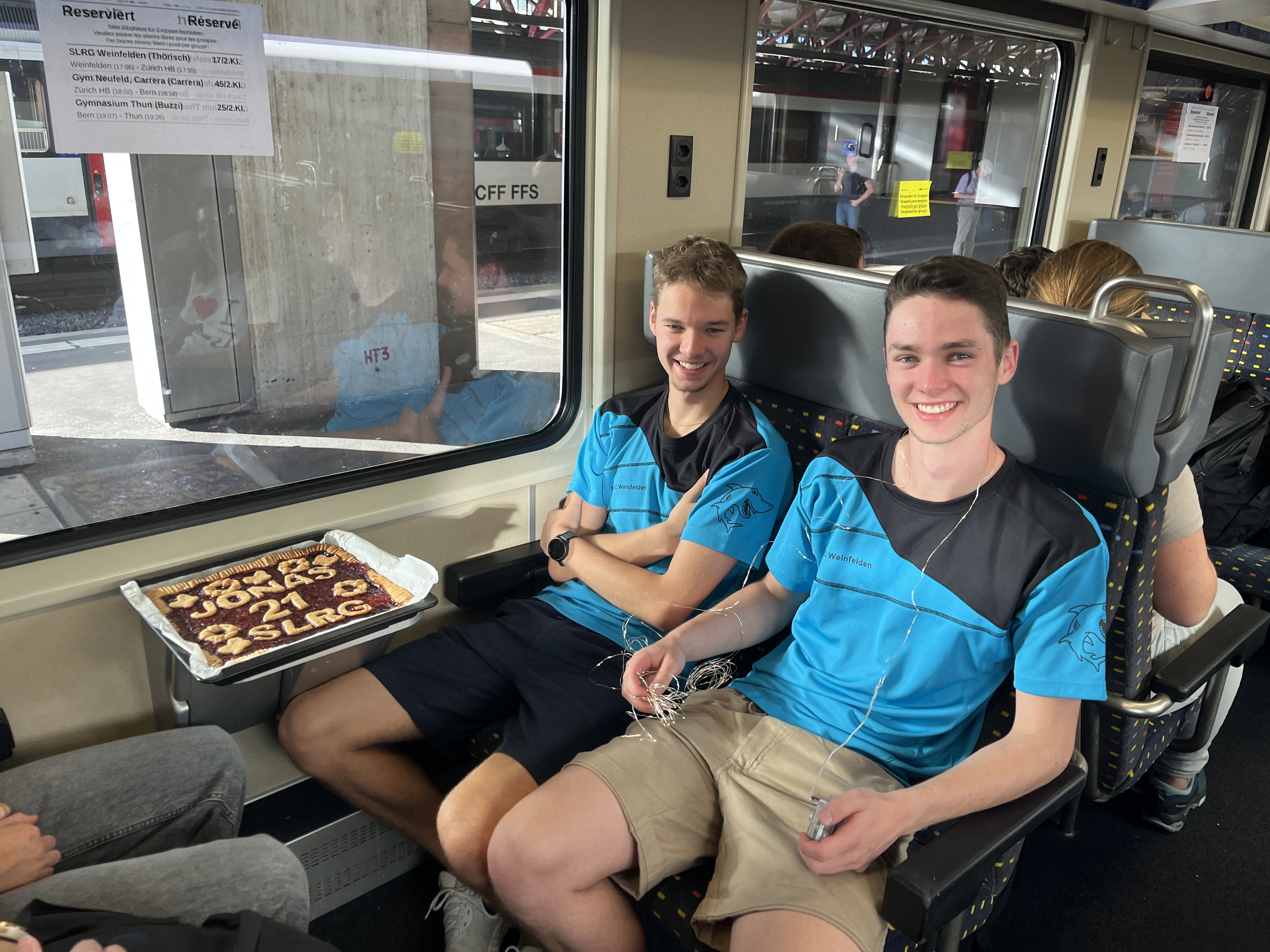 Die Reise begann in Weinfelden – mit gespannter Vorfreude, neugierigen Blicken und einer grossen Frage im Raum: Wohin geht es? Nur die Organisatorinnen kannten das Ziel. Da der Znacht etwas auf sich warten lassen würde, und weil Jonas Geburtstag feierte, wurde die ganze Gruppe zur Feier des Tages mit Kuchen verwöhnt – ein süsser Start in ein grosses Abenteuer.